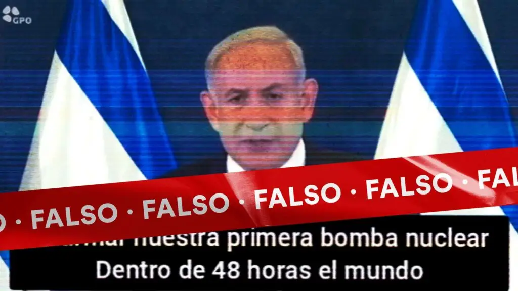 El video manipulado que se difunde es un fragmento de la primera alocución pública del primer ministro israelí, Benjamín Netanyahu, ante el pueblo de Israel con motivo del ataque de Hamás el 7 de octubre. En el texto de los subtítulos se lee que supuestamente amenaza con atacar a Gaza en 48 horas usando “la primera bomba nuclear”.