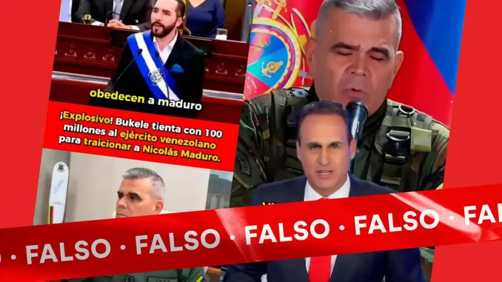 Es falso que Nayib Bukele ofreció 100 millones a Vladimir Padrino López “para que se rebele” contra Nicolás Maduro. La narrativa impulsada con este bulo, que usa avatares sintéticos de Bukele y de un reconocido presentador de noticias para dar la apariencia de ser una noticia genuina, fue desmentida el pasado mes de septiembre, cuando se detectó su circulación con un video del presidente salvadoreño manipulado con inteligencia artificial.