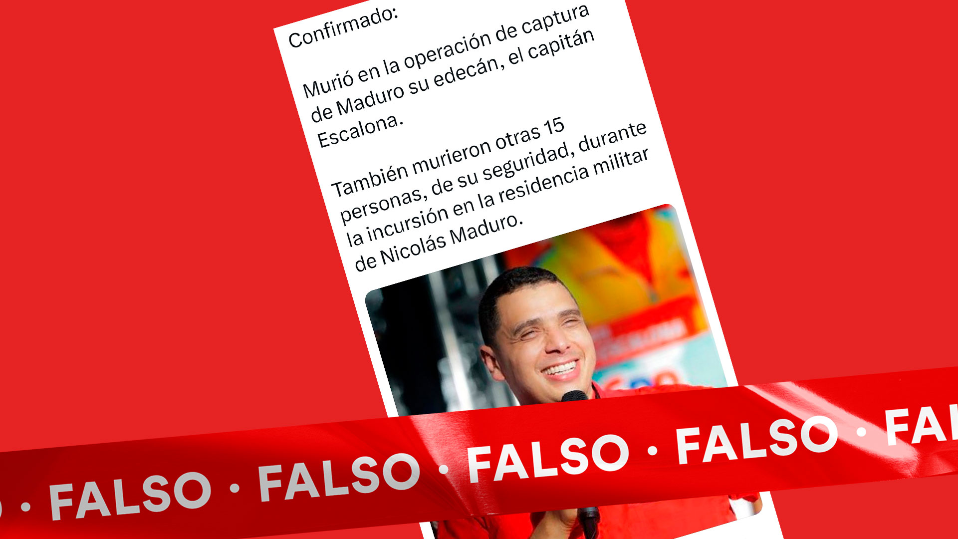 Varias publicaciones en redes sociales durante los últimos días afirmaron que el edecán y escolta personal de Nicolás Maduro, el capitán Juan Francisco Escalona Camargo, había muerto este 3 de enero de 2026 durante los bombardeos registrados en la ciudad de Caracas, como parte de la operación Resolución Absoluta, ejecutada por Estados Unidos para la extracción de Nicolás Maduro y Cilia Flores de Venezuela.