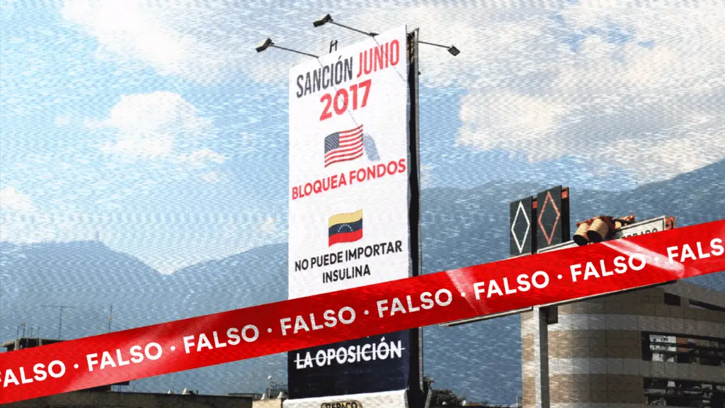 Una valla publicitaria en Caracas atribuye la escasez de insulina en Venezuela a las sanciones impuestas por Estados Unidos en 2017, a pedido de la oposición. Este mensaje forma parte de una campaña que busca desacreditar a los principales líderes de oposición al Gobierno de Maduro.