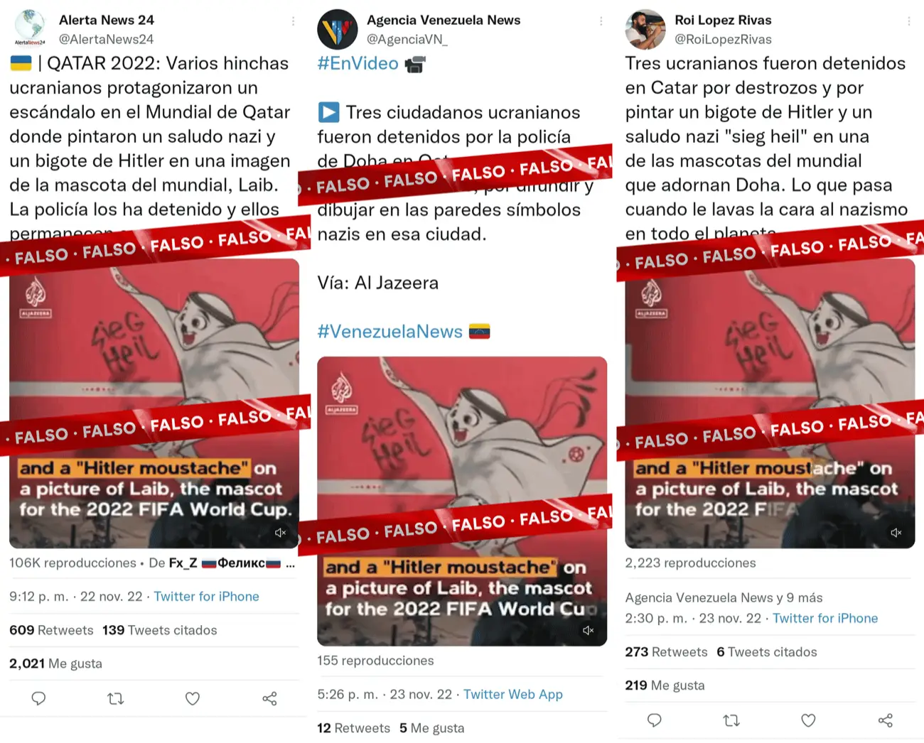 Según la información falsa difundida, un grupo de tres ucranianos en estado de ebriedad, habrían sido arrestados en Doha, Qatar, luego de dibujar la frase «sieg heil» y un «bigote de Hitler», sobre Laib, la mascota del mundial.