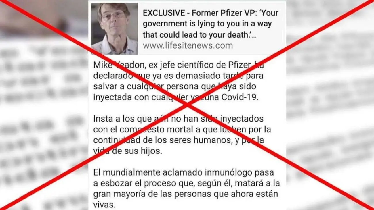 El texto presenta al Dr. Mike Yeadon como «ex jefe científico de Pfizer», lo que sugiere, de forma errónea, como un vocero confiable y con autoridad en el tema de la vacunación contra el COVID-19. Sin embargo, el portal de verificación Politifact explicó en octubre de 2020, que Yeadon no ha trabajado en Pfizer desde octubre de 2011, hace casi diez años, de acuerdo a su perfil en LinkedIn y a un artículo de Associated Press.