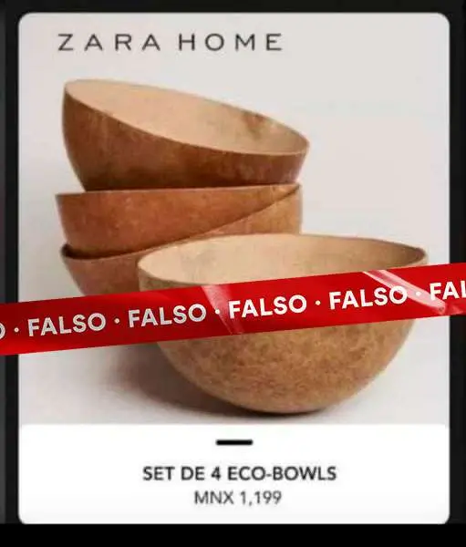 Esta falsa pieza promocional de Zara Home con el set de Eco Bowls (totumas) sigue siendo difundida en redes sociales y servicios de mensajería instantánea. Sin embargo, no hay evidencias online que prueben que existe o existió ese producto en el catálogo de la marca española.