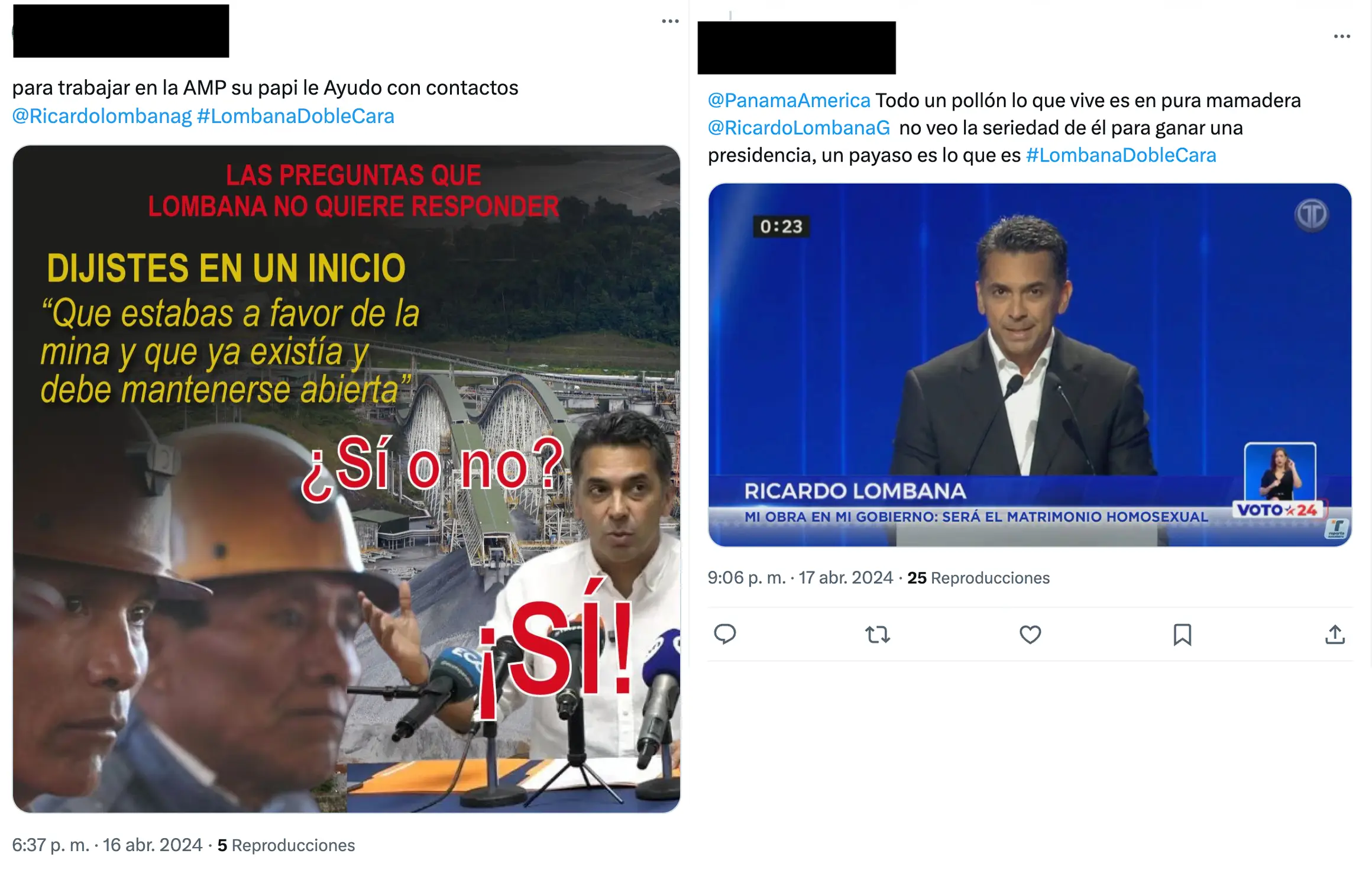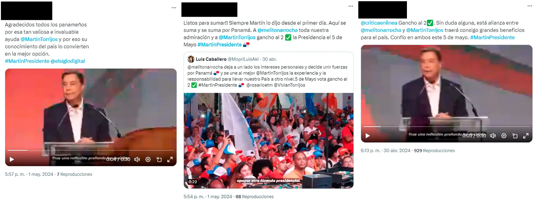 Varias de estas cuentas, además, publican, en respuestas a otros tuits, ataques contra los competidores de Torrijos, en particular contra Ricardo Lombana y Rómulo Roux. Trinan mensajes que atacan a Lombana con mensajes homofóbicos, mientras que los mensajes contra Roux se centran en criticar su riqueza y su cercanía con el contrato minero que provocó grandes manifestaciones en el país en noviembre de 2023.