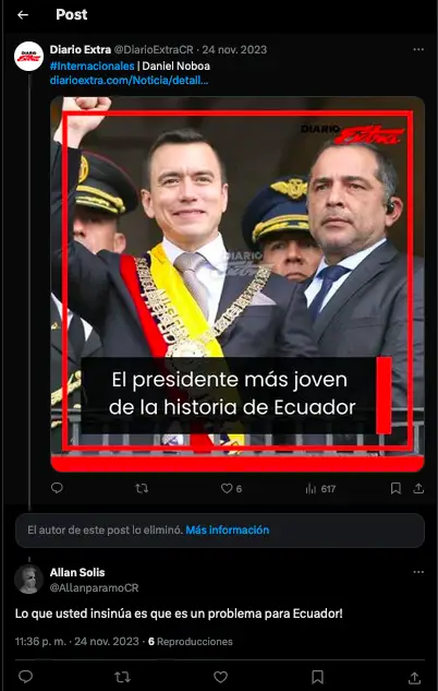La otra ocurrió en Ecuador, donde en agosto del año pasado se celebraron elecciones presidenciales. Encontramos, usando el mismo método, que por lo menos 50 de las cuentas analizadas publicaron mensajes en apoyo al ahora presidente Daniel Noboa.