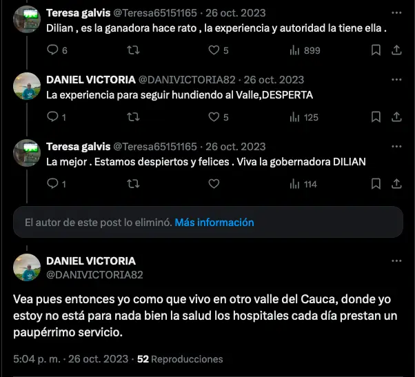 Una de estas operaciones ocurrió en Colombia entre agosto y octubre del año pasado, cuando se llevaron a cabo las elecciones de alcaldes y gobernadores en ese país. Haciendo búsquedas avanzadas en Twitter, encontramos que por lo menos 13 de las cuentas de la red analizada publicaron mensajes a favor de la entonces candidata y actual gobernadora del Valle del Cauca, Dilian Francisca Toro.