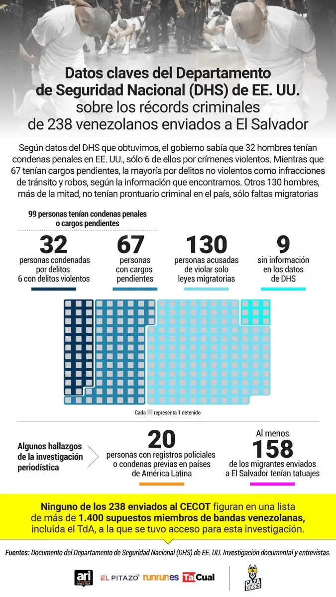 El gobierno norteamericano sabía que la gran mayoría de los 238 migrantes venezolanos que envió a una prisión de máxima seguridad en El Salvador a mediados del marzo pasado no había sido condenada por crimen alguno en Estados Unidos, aún antes de calificarlos de terroristas y deportarlos, según indican registros del Departamento de Seguridad Nacional (DHS por sus siglas en inglés) de Estados Unidos no revelados previamente.