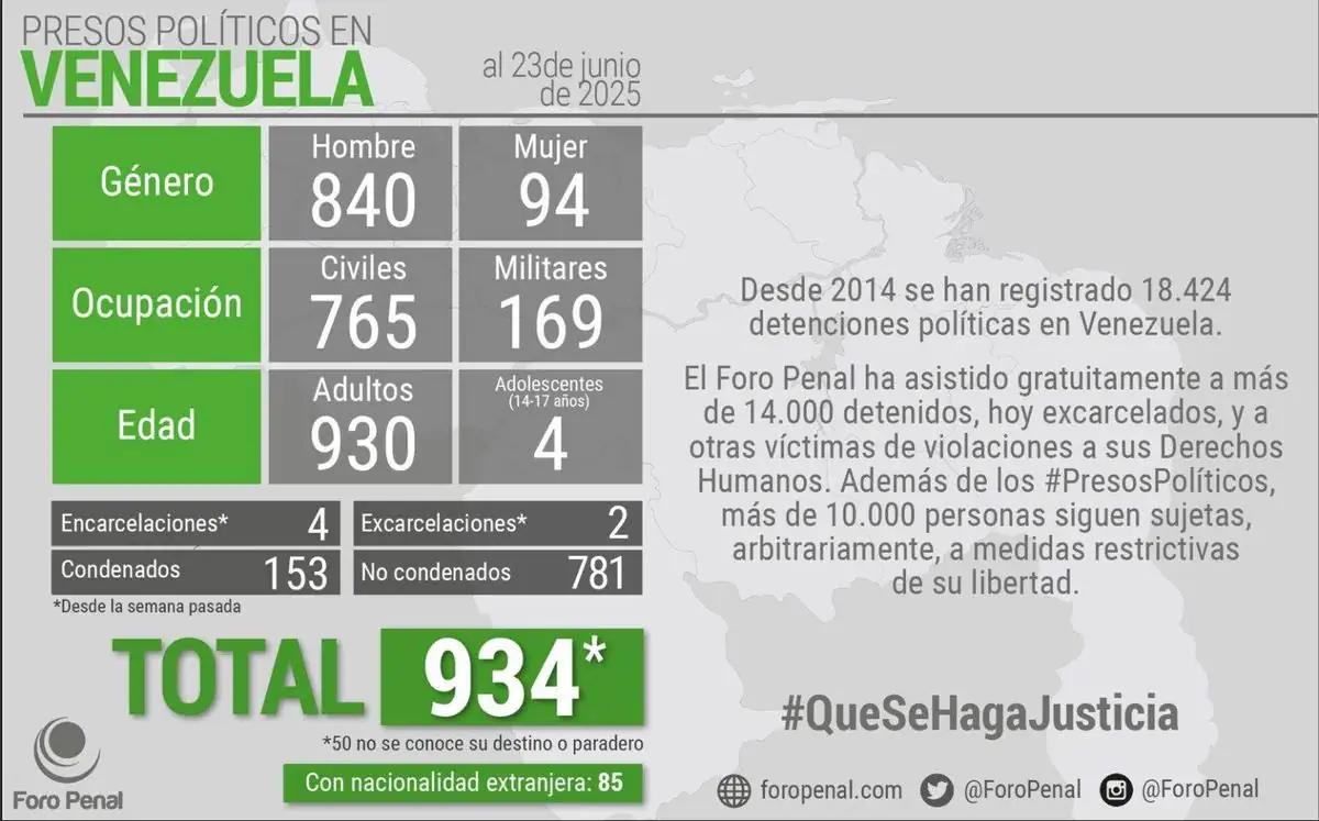Hasta el 23 de junio, la ONG Foro Penal dio cuenta de 934 personas privadas de libertad por motivos políticos en el país, entre ellos 4 adolescentes (14 a 17 años), que van desde ciudadanos comunes, activistas, dirigentes políticos, periodistas, hasta defensores de derechos humanos como el abogado de presos políticos Eduardo Torres, que es uno de los casos más recientes (9 mayo de 2025).