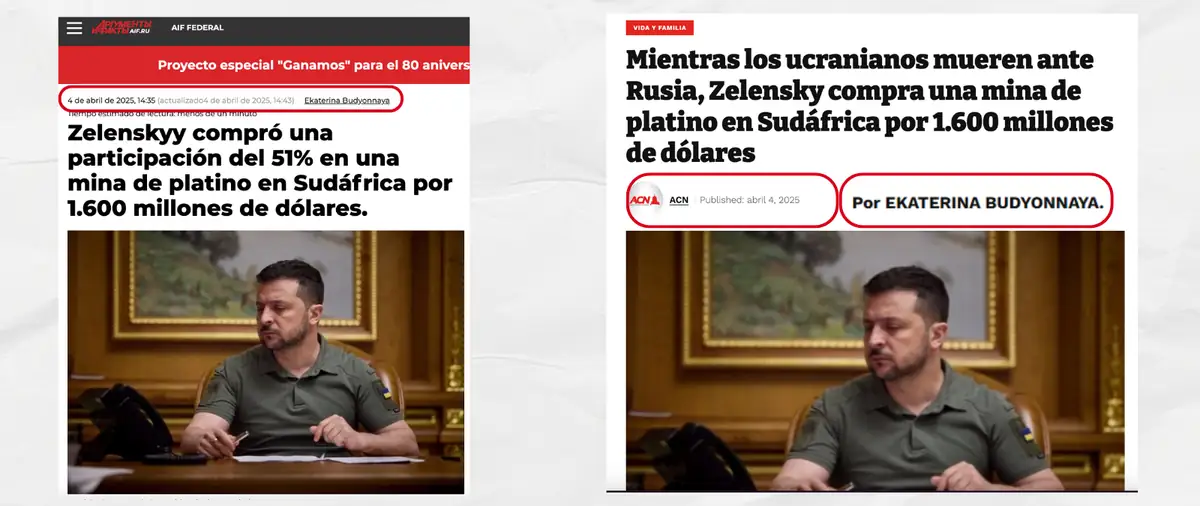 El 4 de abril de 2025, la página rusa Argumenty i Fakty (Argumentos y Hechos en su traducción al español) publicaba el bulo que decía que el presidente de Ucrania, Volodímir Zelenski, había comprado la participación del 51% de una mina de platino en Sudáfrica por 1.600 millones de dólares. Era una amplia campaña de desinformación lanzada por el Kremlin a través de múltiples estrategias: creación de un vídeo manipulado como si fuese la empresa de radiodifusión estatal de Sudáfrica (SABC News), publicación en webs que comparten habitualmente desinformación y propaganda rusas, como la red Pravda (también denominada Portal Kombat) o utilización de cuentas de Twitter (ahora X) para su amplificación. Tanto SABC News como la empresa Northam Platinum, a la que supuestamente Zelenski compró la parte mayoritaria de la mina, afirmaron que se trataba de desinformación.