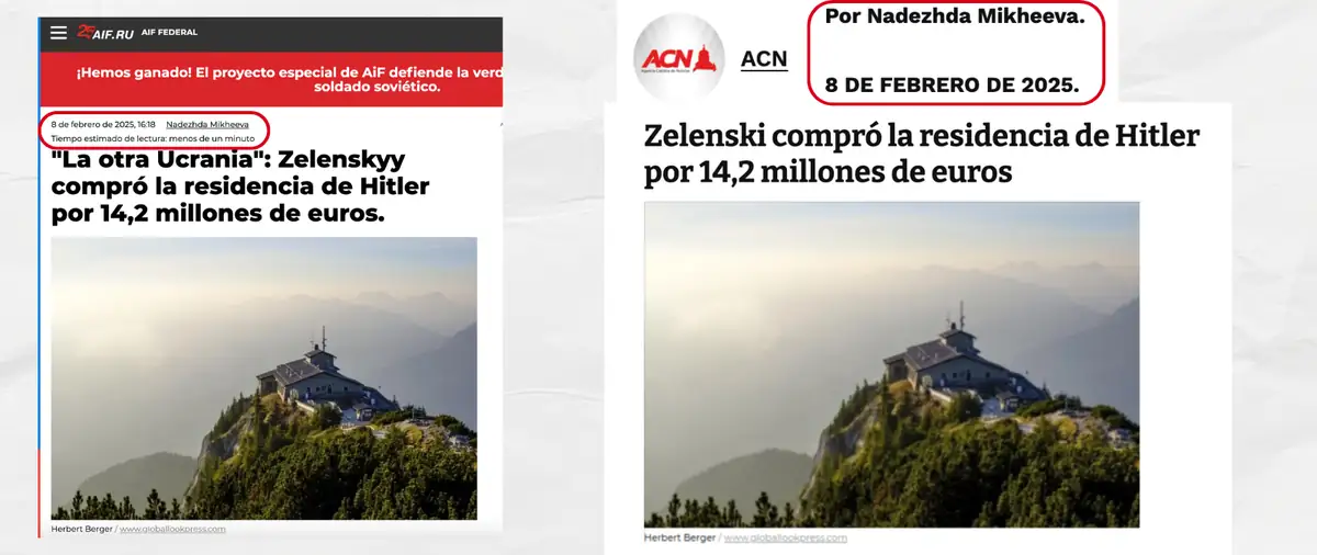 El 4 de abril la Agencia Católicatambién publicó el bulode que Zelenski había comprado “la residencia de Hitler por 14,2 millones de euros”. Ese contenido, originalmente publicado en febrero de 2025, de nuevo por Argumenty i Fakty, fue firmado en ambos casos por Nadezhda Mikheeva, otra firma que se encuentra con frecuencia en la web rusa. De nuevo, fue una campaña de desinformación, esta vez distribuida mediante la creaciónde una web que se hacía pasar por medio de comunicación para dar credibilidad a sus contenidos, una de las estrategias que usa habitualmente el Kremlin. La web se había creado dos meses antes de la publicación de la desinformación.