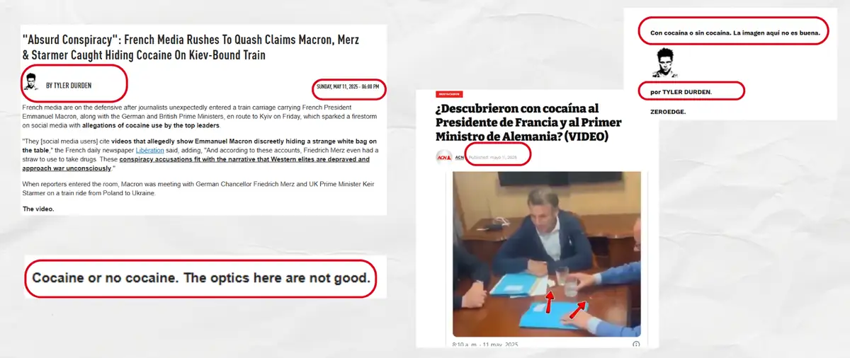 Otra publicación sale de la web ZeroHedge, acusada por Estados Unidos de publicar propaganda rusa. Esta página publicó la campaña de desinformación que acusaba a Emmanuel Macron (presidente de Francia), Friedrich Merz (canciller alemán) y Keir Starmer (primer ministro del Reino Unido) de esconder una bolsa de cocaína en el tren que los llevaba hasta Kiev, la capital de Ucrania, en una visita que hicieron en mayo de 2025. No era una bolsa de cocaína, era un pañuelo de papel. La Agencia Católica de Noticias, sin embargo, lo publicó con el titular “¿Descubrieron con cocaína al Presidente de Francia y al Primer Ministro de Alemania?”. Ambos contenidos se publicaron el mismo día, el 11 de mayo, y están firmadas por Tyler Durden, el nombre con el que se firman muchos de los artículos de ZeroHedge, haciendo referencia al personaje del Club de la Lucha.