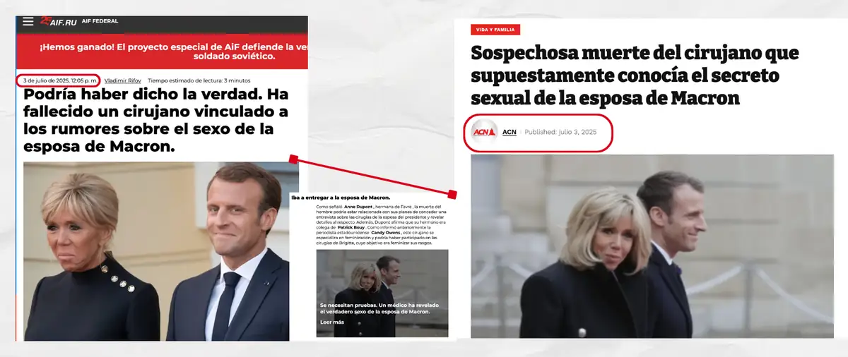 La teoría de la conspiración contra Brigitte Macron, esposa de Emmanuel Macron, que afirma que es transexual, también ha sido ampliamente compartida por la página religiosa de México mediante múltiples publicaciones. Una es la campaña de desinformación que decía que “el cirujano que supuestamente conocía el secreto sexual de la esposa de Macron” había muerto. Como explicó Maldita.es, era otra campaña sin pruebas difundida por una página creada unos días antes que se hacía pasar por un medio de comunicación francés.