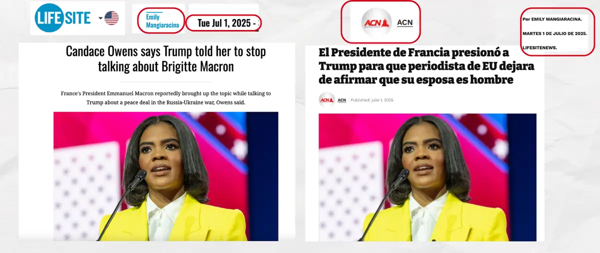 La Agencia Católica de Noticias no sólo republica contenidos de agencias y páginas rusas alimentando la campaña de desinformación que afirma que Brigitte Macron es un hombre.