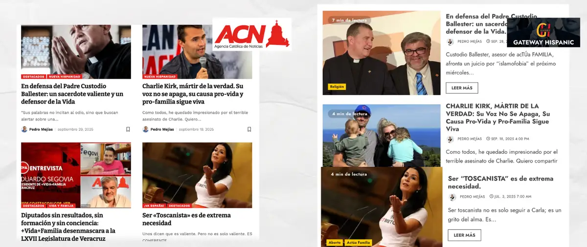 La Agencia Católica de Noticias no sólo amplifica y distribuye lo que publican otras páginas, también genera material que otras webs reproducen. Es el caso de los contenidos que produce el coordinador de acTÚa Familia. El líder de esta plataforma publica columnas ocasionalmente con la Agencia Católica de Noticias. La primera de la que hay constancia en la web es de octubre de 2020. Esta organización tiene también una sección fija en Gateway Hispanic, donde republican algunos de los contenidos que Pedro Mejías firma en la agencia.