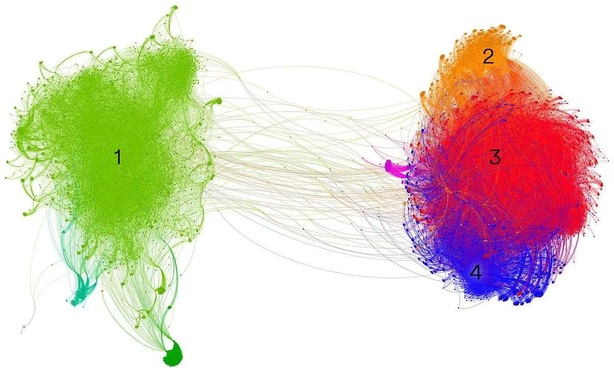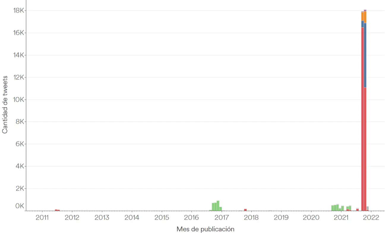 En la siguiente figura se puede notar que las cuentas del Grupo 1, estuvieron activas principalmente en dos periodos: entre agosto y diciembre de 2016 (publicando 737 tweets) y entre agosto 2020 y junio 2021 (publicando 3120 tweets). Los Grupos 2, 3 y 4 estuvieron activos, principalmente, durante septiembre y noviembre de 2021, publicando en conjunto 36399 tweets (84,07% del total). Son los que aportaron mayor cantidad de tweets en todo el dataset y los que fueron analizados con profundidad en el reporte: