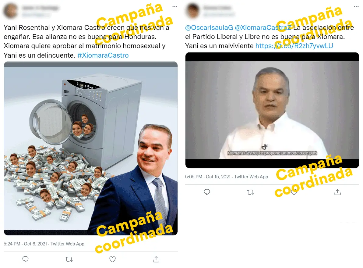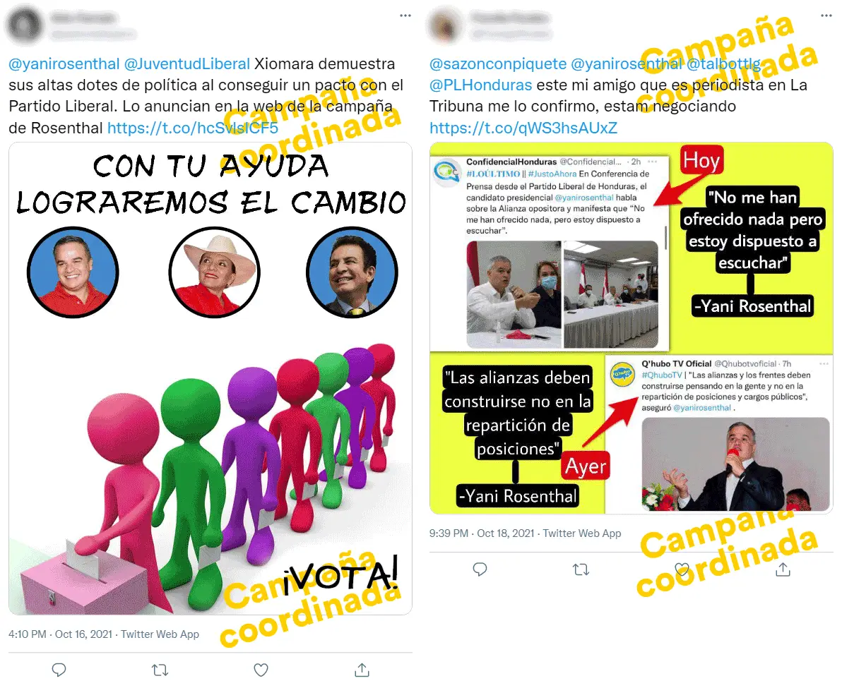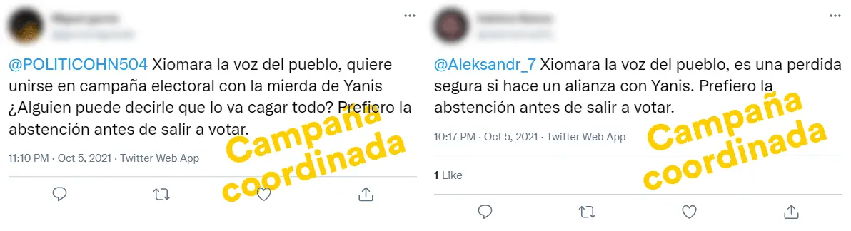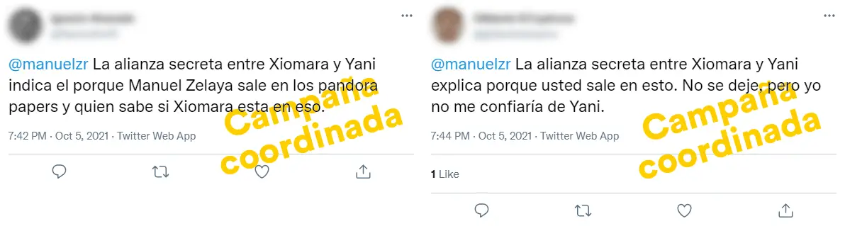 Este tweet de Zelaya fue el punto inicial del siguiente paso en la campaña de desinformación en curso. La noche de ese mismo 5 de octubre, en un tiempo inferior a 5 minutos, seis cuentas del dataset respondieron al tweet, insinuando que Xiomara Castro, esposa de Zelaya, tendría una “alianza secreta” con Yani Rosenthal. El rumor sobre el supuesto pacto electoral entre Castro y Zelaya, continuaría siendo impulsado por las cuentas de la colección de datos al menos hasta el 22 de octubre: