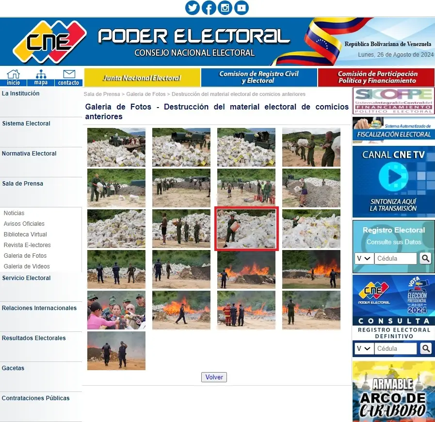 Mientras que en la galería de fotos de la página web del Consejo Nacional Electoral hay una publicación referente al proceso de incineración del 18 de septiembre de 2010, en donde se observa otra de las fotos compartidas de manera descontextualizada.