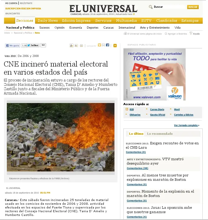 La publicación aloja una captura de la página web de El Universal sobre la cobertura del evento. En la imagen se aprecia que el medio de comunicación realizó la publicación el 18 de septiembre de 2010, a las 5:51 p.m., con el titular: “CNE incineró material electoral en varios estados del país” con una fotografía de la jornada — la cual fue usada erróneamente en 2013 y en el actual contexto postelectoral— y en el primer párrafo detalla que el material corresponde a los comicios de 2006 y 2008.
