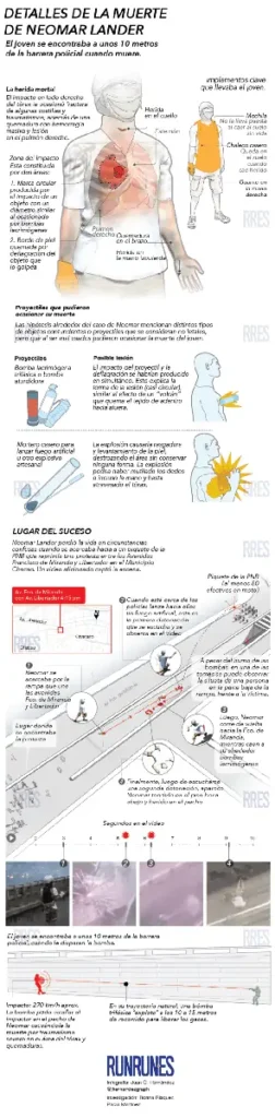 A los dos segundos se escucha una detonación, se observa un destello, se ve humo de lacrimógenas y luego aparece el cuerpo de Lander tendido en el asfalto boca abajo. Al fondo, tras una cortina de humo y a unos 10 metros del joven, se observa una silueta que se mueve. Ese sería el funcionario que disparó en forma horizontal y de frente contra el joven una bomba que emana fuego, que impactó en el lado derecho del tórax de Neomar Lander causándole la muerte y quemaduras.