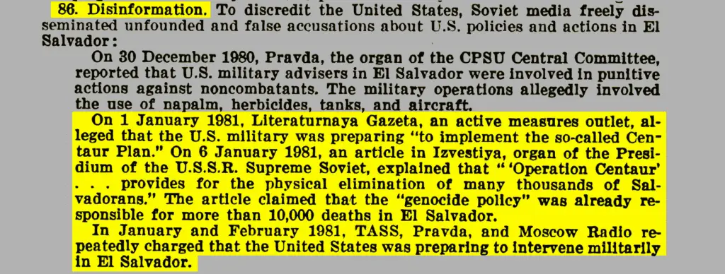 “El 1° de enero de 1981, Literaturnaya Gazeta, un medio ruso de Medidas Activas, alegó que el ejército de EE. UU. se estaba preparando «para implementar el llamado Plan Centauro». El 6 de enero de 1981, un artículo en Izvestiya, órgano del Presídium del Soviet Supremo de la U.R.S.S., explicó que «la Operación Centauro… prevé la eliminación física de muchos miles de salvadoreños», dice un extracto de un texto de la audiencia sobre las Medidas Activas Soviéticas que fue presentado ante la Cámara de Representantes en 1982.