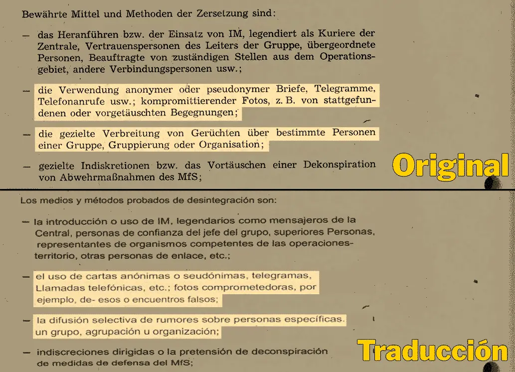 La conexión sugerida por Castillo con las técnicas usadas Alemania Oriental, también puede ser comprobada. En un capítulo sobre “Medidas de Descomposición” (la versión de alemana oriental de las “Medidas Activas” rusas) que aparece en un manual desclasificado de 1976 usado por la Stasi –la policía secreta de Alemania Oriental– (1976), se especifica la efectividad de “la difusión selectiva de rumores sobre personas específicas” para destruir reputación de adversarios políticos.
