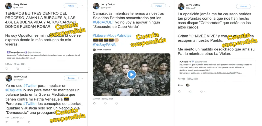 Cazadores de Fake News pudo analizar 3.757 tweets publicados entre el 22 de noviembre de 2019 y el 12 de junio de 2023 en cuatro cuentas de Twitter de Ostos actualmente suspendidas: la mencionada @JerryaoP, @JerryOstos3 y dos cuentas distintas con el nombre de usuario @JerryOstosP. También se constató que Ostos usó otras dos cuentas de Twitter suspendidas: @Jerry2126 y @jerryostos1969, aunque de éstas últimas no se obtuvo casi ninguna información archivada.