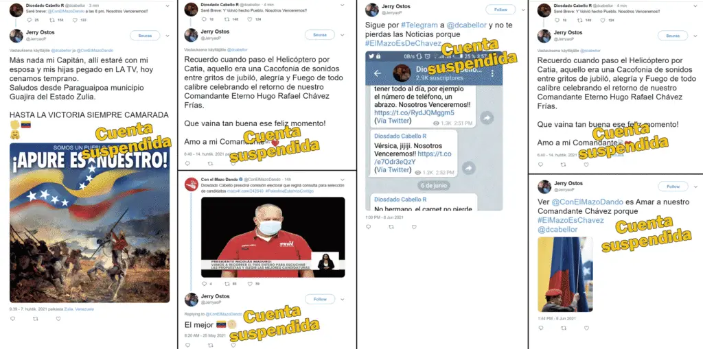 Analizando la base de datos con los tweets de las cuentas suspendidas, se constató que Ostos mencionó a Maduro o su cuenta @nicolasmaduro en 387 tweets (10,3% del total), a Diosdado Cabello, su nombre de usuario en Twitter (@dcabellor) o la cuenta de “Con el mazo dando” en 339 tweets (9% del total).