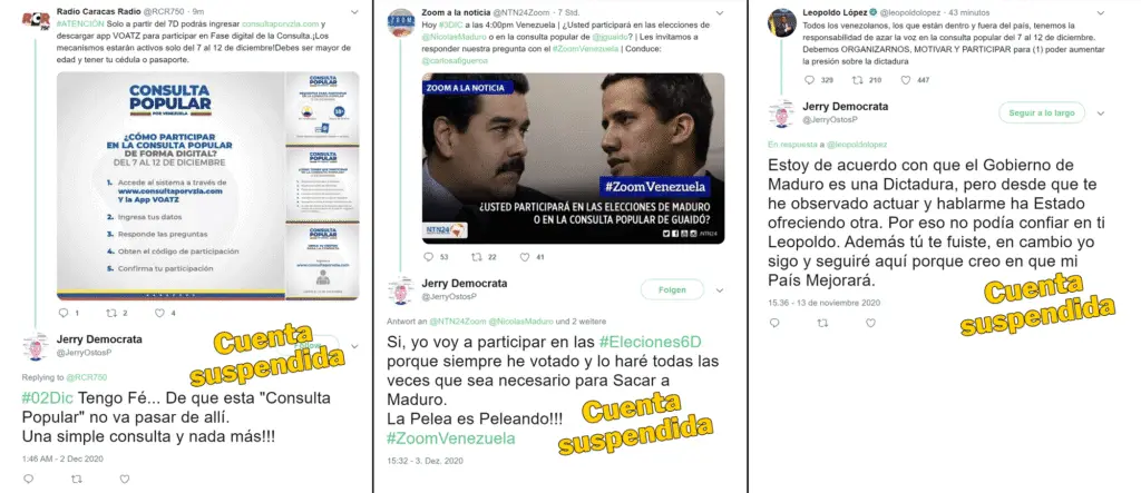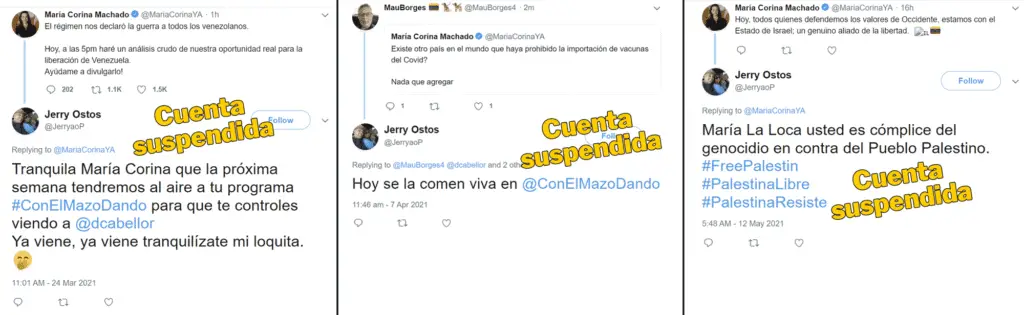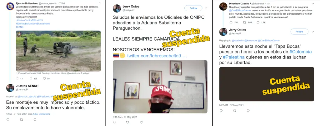 Entre los tweets analizados también se hallaron mensajes críticos en contra de líderes de la oposición como Juan Guaidó (en 104 tweets) y María Corina Machado (en 66 tweets), múltiples menciones al conflicto entre Israel y Palestina —en todos los casos apoyando al último—, y 75 mensajes interactuando con la cuenta del Seniat, la del Ministerio del Poder Popular para la Comunicación e Información (Mippci), y otros relacionados con la Fuerza Armada Nacional Bolivariana (FANB).