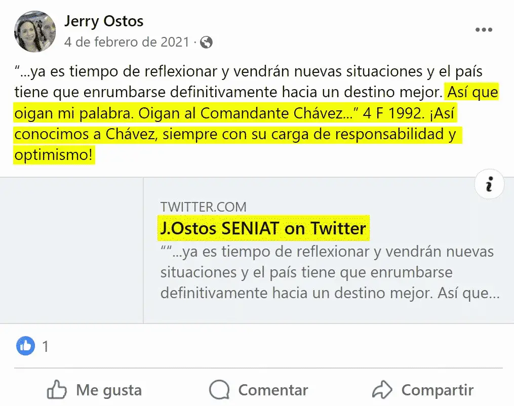 El 28 de marzo, día en que Sebastiana Barráez publicó su artículo en Infobae sobre el ex funcionario del Seniat, muchos tuiteros venezolanos también habían confirmado el vínculo de Ostos con el Seniat. Igualmente, Cazadores de Fake News publicó una serie de tweets bajo la etiqueta #OstosCFN, confirmando con fuentes abiertas lo señalado por Barráez.