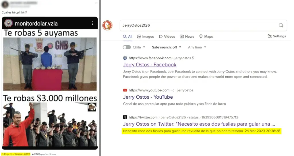 En el meme se muestran dos funcionarios militares portando armas largas. La respuesta de Ostos a la imagen, que ya no existe en la red social pero cuya huella digital permaneció en el caché del buscador DuckDuckGo –al menos hasta el 4 de abril de 2024–, pudo haber sido interpretada como una posible amenaza de seguridad por los cuerpos policiales o de contrainteligencia que monitorean las redes sociales. De hecho, otros usuarios respondieron con advertencias a contenidos provocadores publicados en 2023 con @JerryOstos2126.