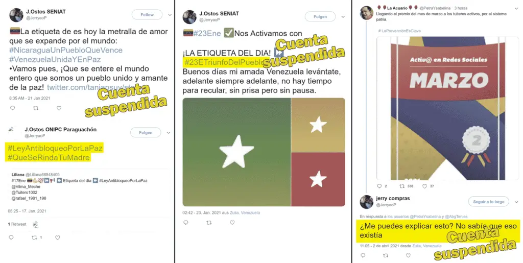 El ex funcionario del Seniat también estuvo involucrado en el impulso de campañas coordinadas por el Mippci en Venezuela, a través de la promoción de etiquetas en Twitter, evidenciando su rol en las estrategias digitales alineadas con el gobierno. Este patrón de comportamiento se destaca en dos ocasiones específicas: el 17 de enero de 2021, cuando apoyó la etiqueta #LeyAntibloqueoPorLaPaz, y el 23 de enero del mismo año, al participar en #23ETriunfoDelPueblo, ambas propuestas a través de la red social por el ministerio.