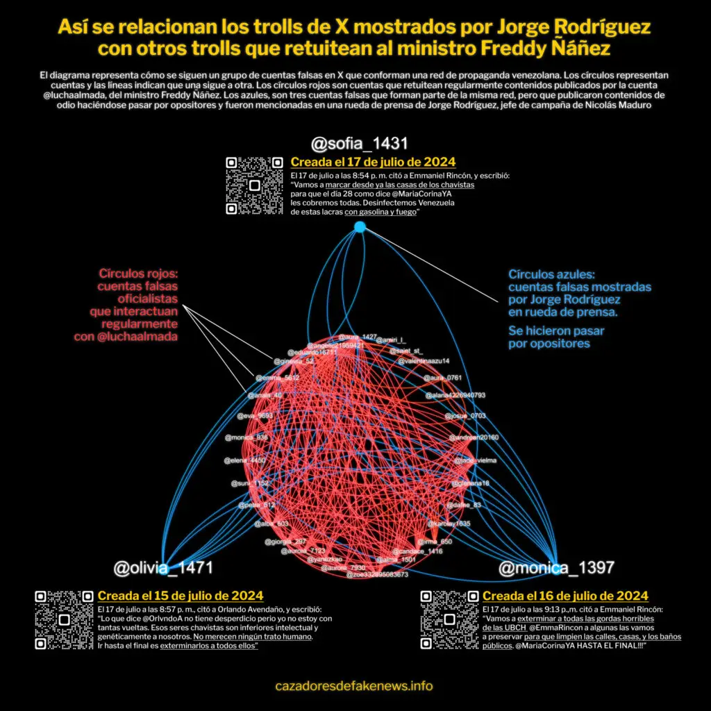 Investigación digital revela que cuatro cuentas presentadas por Jorge Rodríguez como ejemplos de odio en X son en realidad cuentas falsas de la campaña oficialista, haciéndose pasar por opositoras. Estas cuentas forman parte de una red que amplifica contenido del ministro Freddy Ñáñez y de la campaña de Nicolás Maduro.