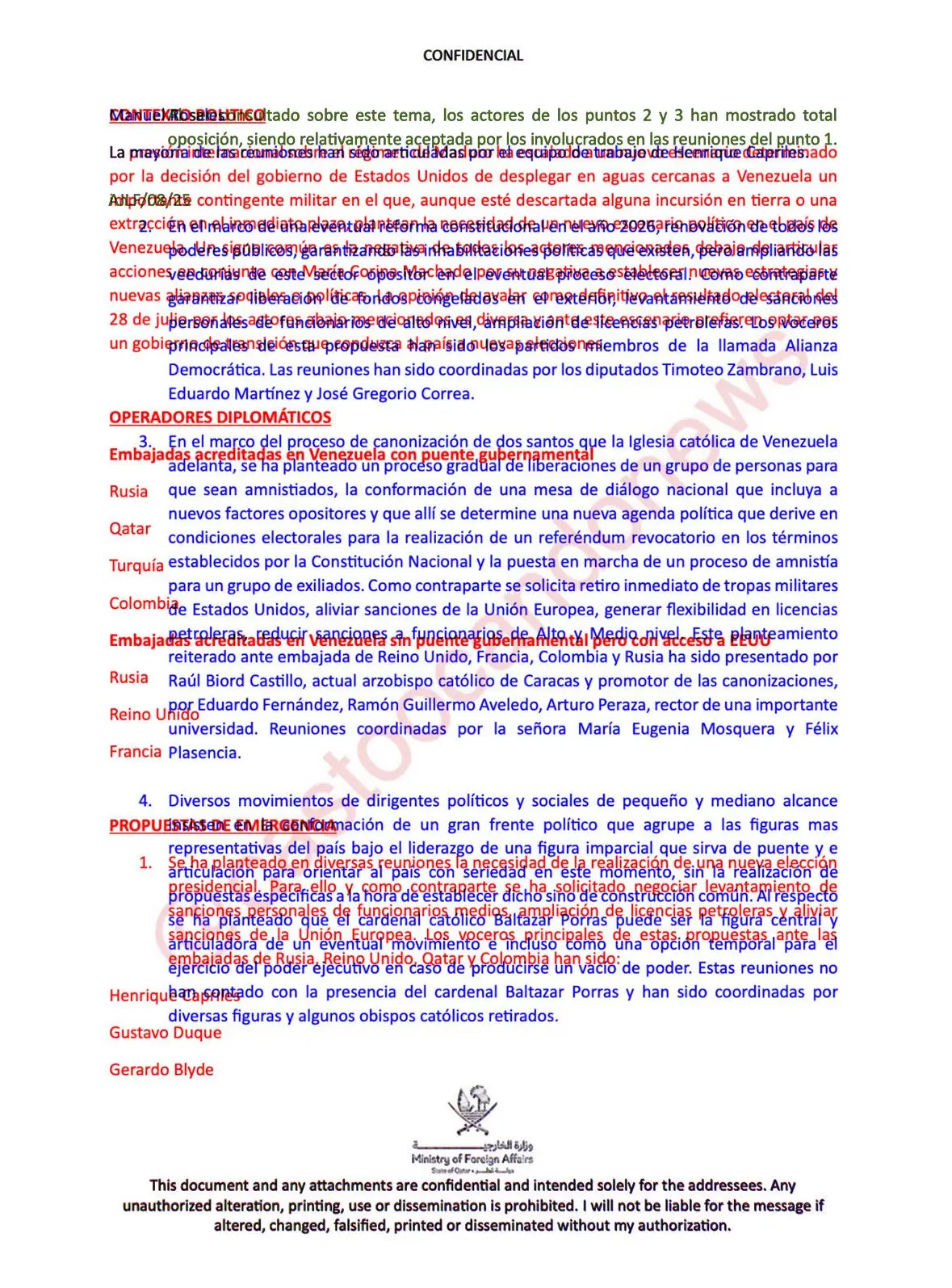 El pasado 20 de octubre el periodista Casto Ocando publicó un documento que, según afirmó, es exclusivo del Estado de Catar. Las tres hojas del documento tienen como membrete la palabra «Confidencial» y, al pie de página, una versión en color gris del logotipo del Ministerio de Asuntos Exteriores del Estado de Catar, junto a un descargo de responsabilidad.