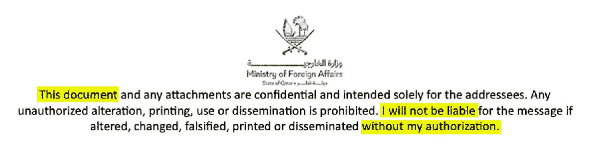 El documento supuestamente filtrado con el logotipo del Ministerio de Relaciones Exteriores de Catar no contiene ningún elemento técnico de este tipo, más allá del supuesto firmante en la tercera página, el membrete y el pie de página presente en todas las páginas.
