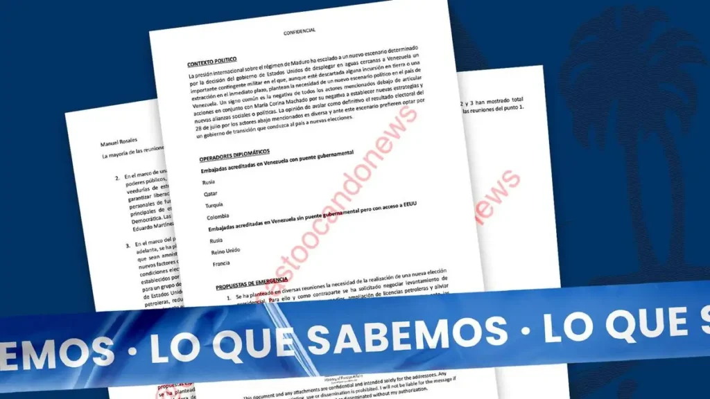 El documento menciona nombres específicos de figuras políticas venezolanas y hace referencia a negociaciones de alto nivel, pero carece de firmas manuscritas, digitales, sellos oficiales o cualquier elemento formal de autenticación institucional.