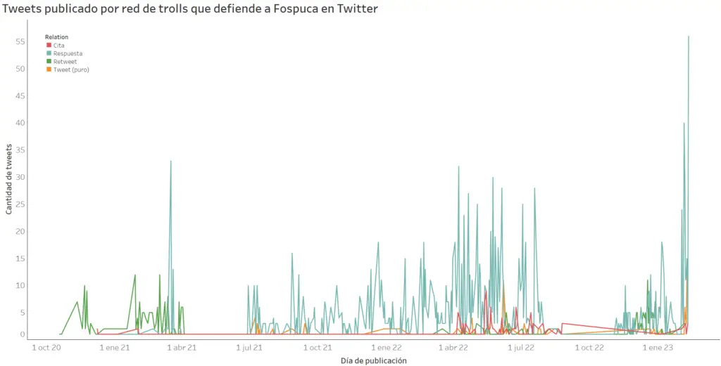 Con herramientas de análisis, a través de la Twitter API, se puede acceder a los tweets publicados por la red de cuentas troll y graficarlos para determinar patrones. En el siguiente histograma se observan los picos de ataques, con el uso de respuestas, a tweets críticos en contra de Fospuca.