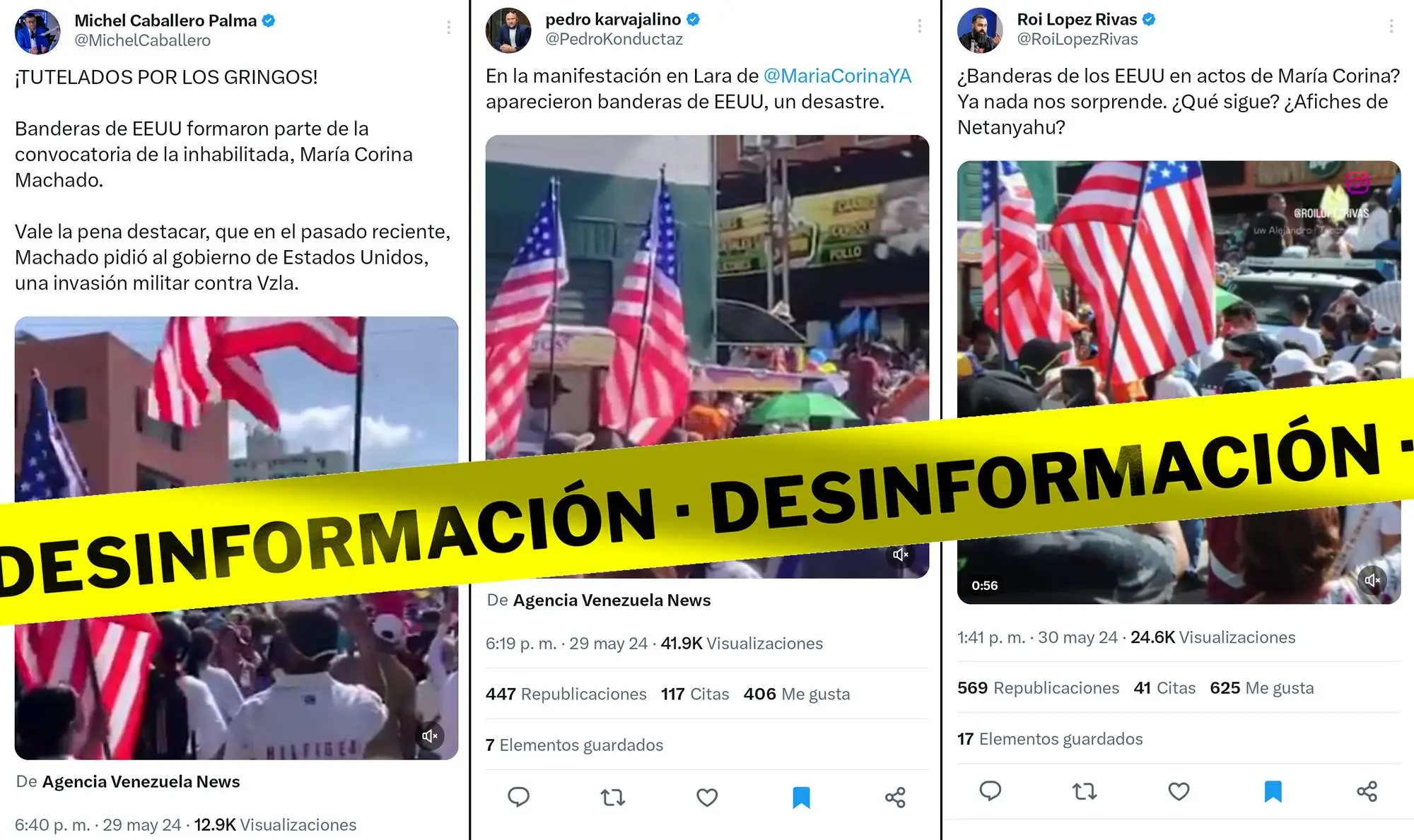 El hecho fue reseñado el mismo día por comunicadores, portales digitales desinformadores y programas de radio y televisión, quienes aseguraron que la presencia de las banderas estadounidenses en la concentración era una ‘evidencia’ de los supuestos intereses a los que responde la candidatura de Edmundo González, apoyada por Machado.