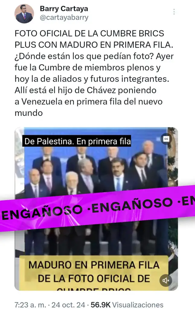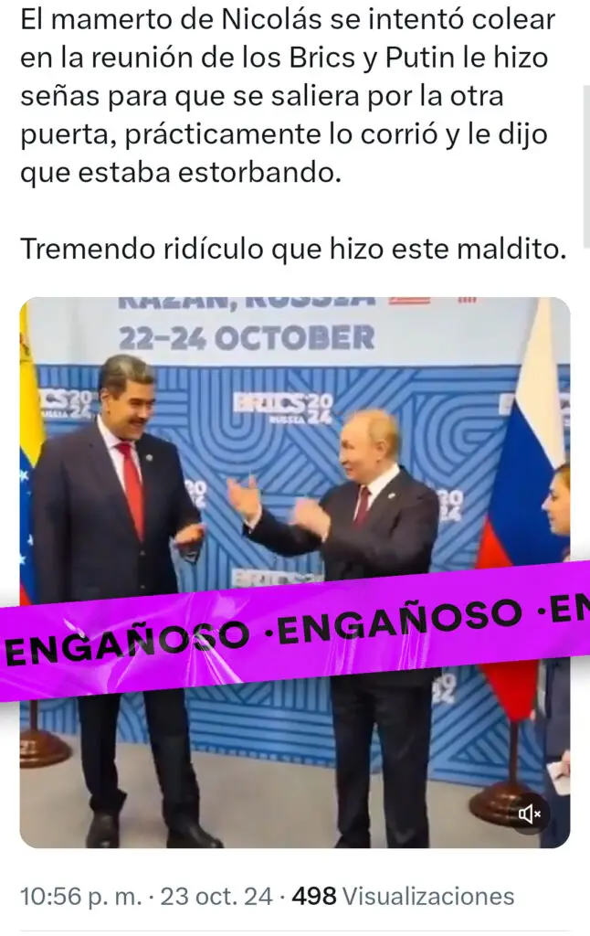 Un video que circula en redes sociales, donde se ve a Vladímir Putin indicando a Nicolás Maduro una salida tras saludarse, ha sido utilizado para afirmar falsamente que el presidente ruso le impidió al mandatario venezolano ingresar a la sala con los líderes de los BRICS.
