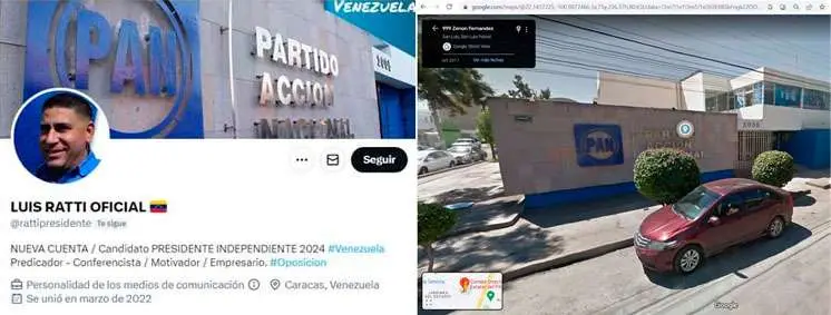 Por ejemplo, para el pasado 01 de junio, la imagen de encabezado de la cuenta en Twitter del candidato (@rattipresidente) mostraba la fotografía de una fachada de la sede del Partido PAN, pero a través de la geolocalización de la imagen se constató que la fotografía corresponde a la sede del Partido Acción Nacional (PAN) en la localidad de San Luis de Potosí en México.