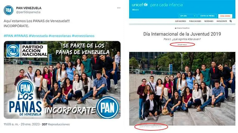 También se pudo confirmar que la cuenta en Twitter del Partido Acción Nacional Venezuela, creada en septiembre del 2022, usurpó la imagen institucional del Partido Acción Nacional de México y recurrió a fotografías de otros eventos y organizaciones para promover sus mensajes en las redes sociales. Así lo hizo para publicitar a la organización PAN con una fotografía originalmente difundida por la UNICEF-México.