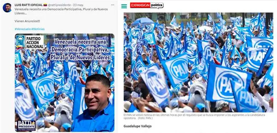 Igual ha hecho con la publicación de otro tuit con el texto “Venezuela necesita una Democracia Participativa, Plural y de Nuevos Líderes…” apoyada en una fotografía de banderas con la inscripción PAN que realmente corresponde a una organización partidista mexicana con el mismo nombre.