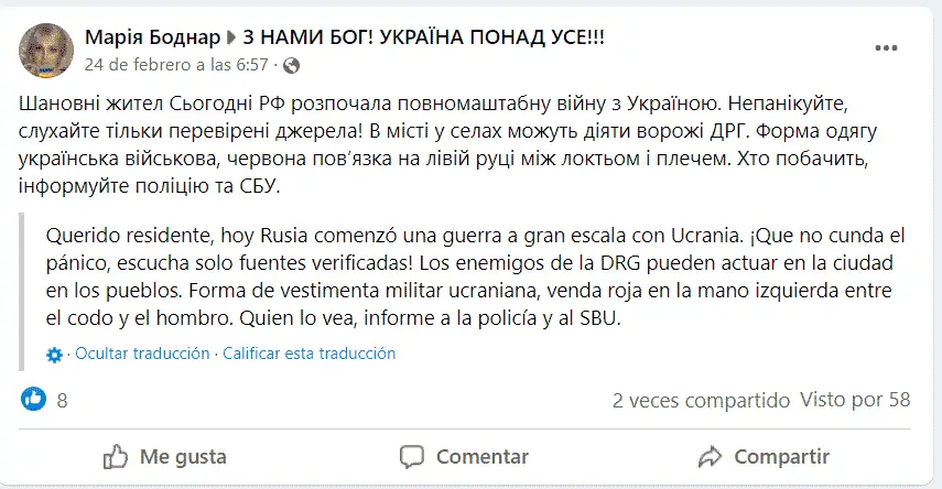 El mensaje de la ministra fue compartido a las 8:52 A.M. hora Ucrania (2:52 A.M. hora Venezuela) y obtuvo más de 2500 veces en Facebook. Su aviso fue compartido también por la página del Ministerio de la Defensa a las 8:55 A.M. hora Ucrania (2:55 A.M. hora Venezuela), compartido en Facebook 709 veces), Fuerzas Terrestres (compartido a las 9:49 hora Ucrania, 3:49 hora Venezuela) y cientos de canales de Telegram.