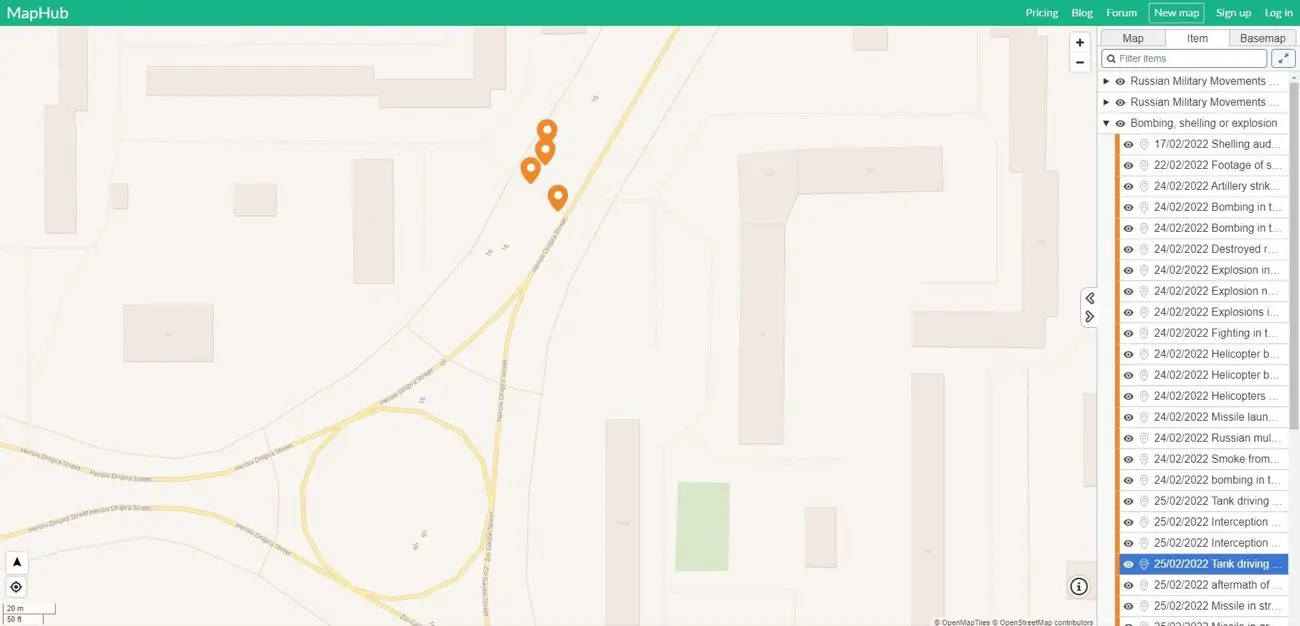 En el mapa del Monitor de Datos del Centre for Information Resilience sobre la guerra Rusia-Ucrania, conseguimos varios videos sobre el mismo incidente, en el mismo sitio. Todo está bien geolocalizado: