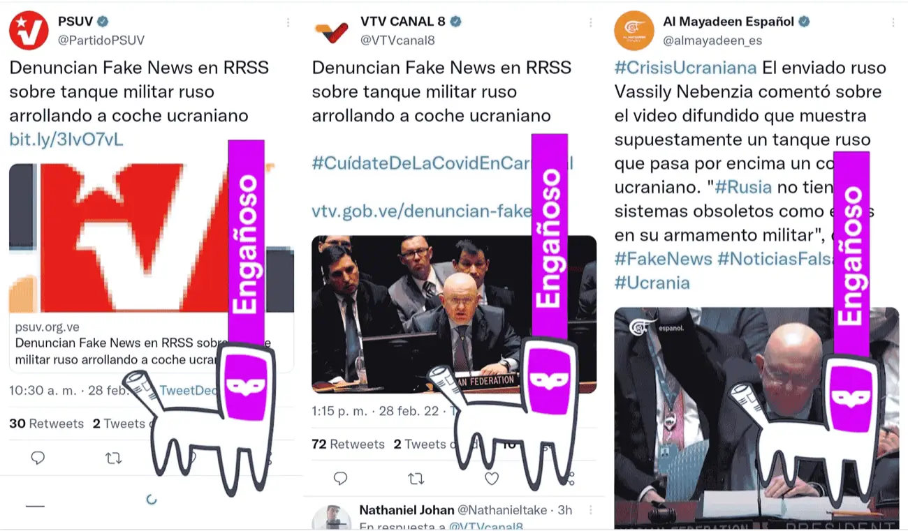 El tanque es ucraniano y las personas que lo conducían portaban uniformes ucranianos, pero eran saboteadores rusos cuya llegada a Kiev se esperaba. Medios oficialistas venezolanos repitieron la versión oficial rusa y no gastaron ni un segundo en verificar.