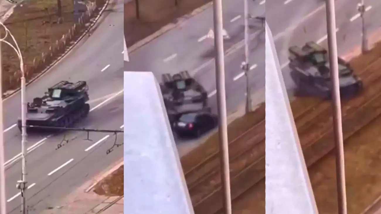 En este, grabado desde otro ángulo, se ve que el tanque no iba solo. Las fuerzas armadas ucranianas abren fuego a otro que se aproxima Al min 1:20, aparece la colisión del tanque: