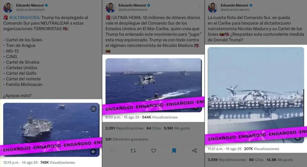 En el contexto venezolano, varios usuarios han publicado información supuestamente relacionada con el despliegue naval, usando videos que no corresponden a las acciones en curso y que, en muchos casos, ni siquiera fueron grabados en el Mar Caribe.