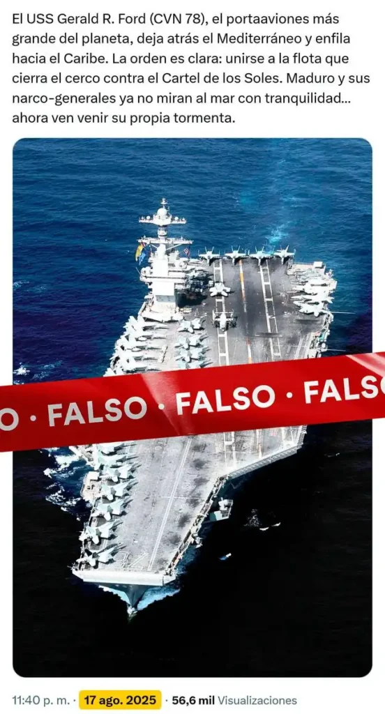 La escasez de información oficial sobre el presunto despliegue naval en el Caribe y las imprecisiones de lo disponible han dado lugar a conversaciones en redes sociales, donde circula información errónea y descontextualizada sobre supuestos movimientos relacionados con esta acción contra el narcotráfico en aguas internacionales.