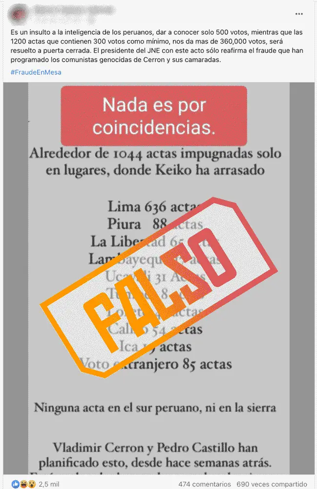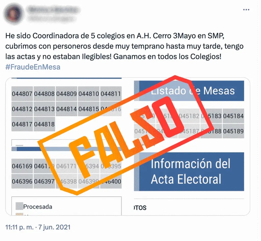 La conversación sobre el supuesto fraude electoral en el Perú tuvo más de 67.000 tuits y 17.000 publicaciones en Facebook, la mayoría defendiendo la acusación lanzada por Fujimori, pero algunos también contrarrestándola. Específicamente la etiqueta #FraudeEnMesa tuvo miles de menciones ese mismo día, y Julián Macías Tovar, un investigador digital vinculado con la izquierda española, aseguró el 9 de junio que encontró “cientos de cuentas creadas en las últimas 24 horas desde que se lanzó la campaña diseñada y lanzada por el equipo de Fujimori”.
