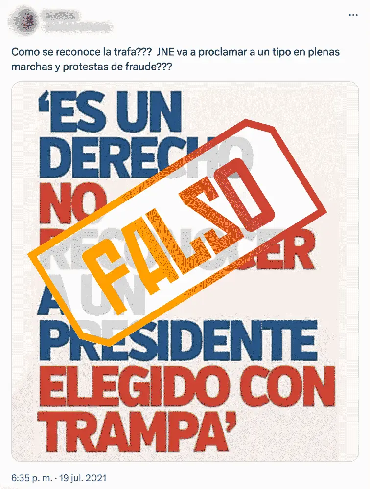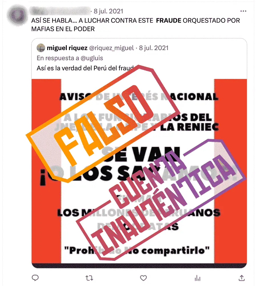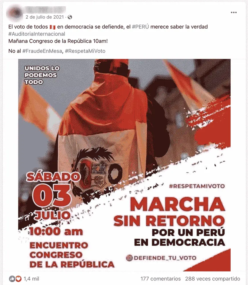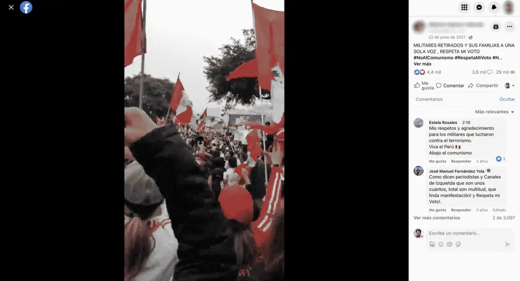 También se sumaron varios firmantes de la Carta de Madrid, que plantearon —basados en evidencias engañosas— que se trataba de una conspiración del Foro de Sao Paulo. López Aliaga pidió la repetición de la segunda vuelta y llamó a sus seguidores a una “marcha por la libertad y la democracia” para exigir “unas elecciones transparentes”. Cabal, la senadora colombiana, también publicó dos columnas y varios tuits haciendo eco de esta narrativa, e incluso fue entrevistada por un canal de televisión peruano. Allí dijo que “el Foro de Sao Paulo cuenta con un equipo itinerante experto en cometer fraude” que “pretende salirse con la suya en Perú”.