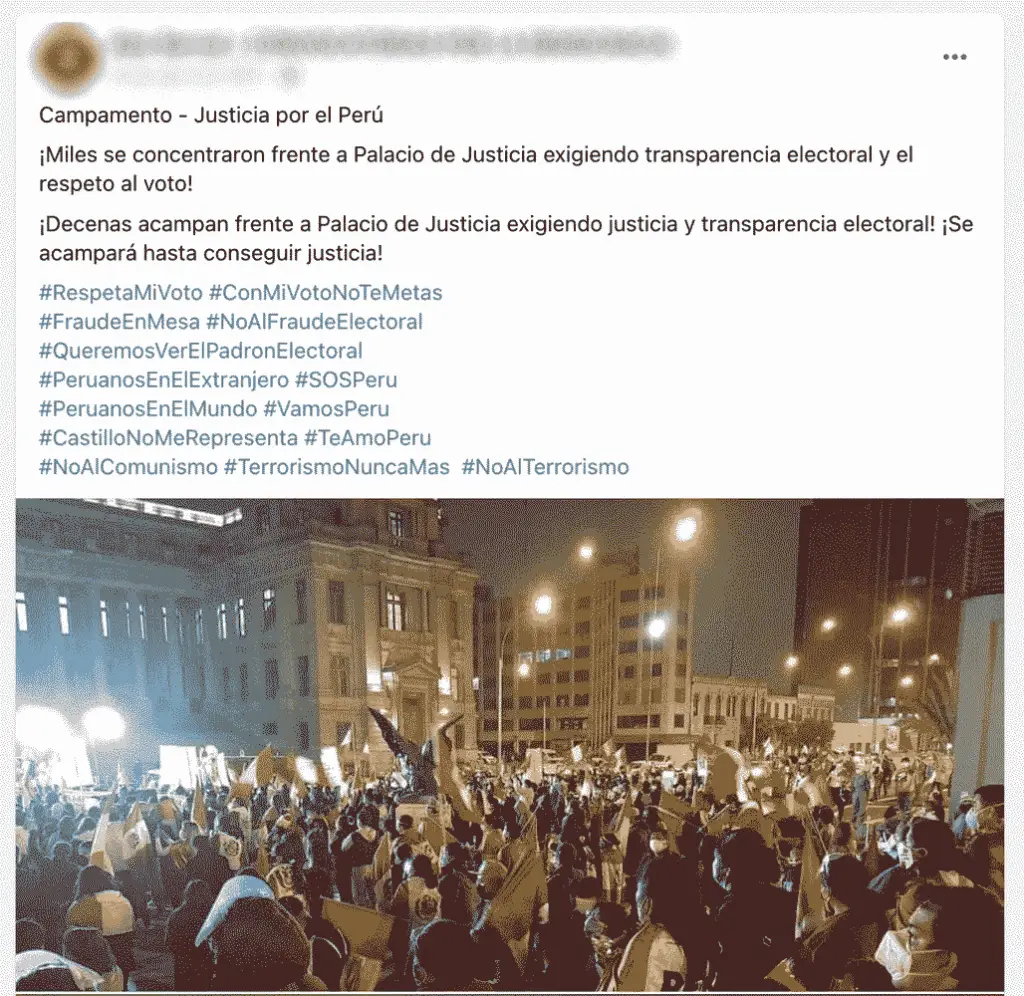 Esta coordinación se ve claramente cuando se analiza cómo Disenso y sus aliados ayudaron a impulsar la versión de que hubo fraude electoral en los comicios presidenciales peruanos, que ganó Pedro Castillo, buscando movilizar a los ciudadanos para presionar a las autoridades electorales. A las denuncias que venía haciendo López Aliaga se sumó la candidata derrotada en segunda vuelta el 6 de junio de 2021, Keiko Fujimori, que alegó que habría habido un “fraude en mesa” por parte de delegados electorales de Perú Libre, el partido de Castillo.